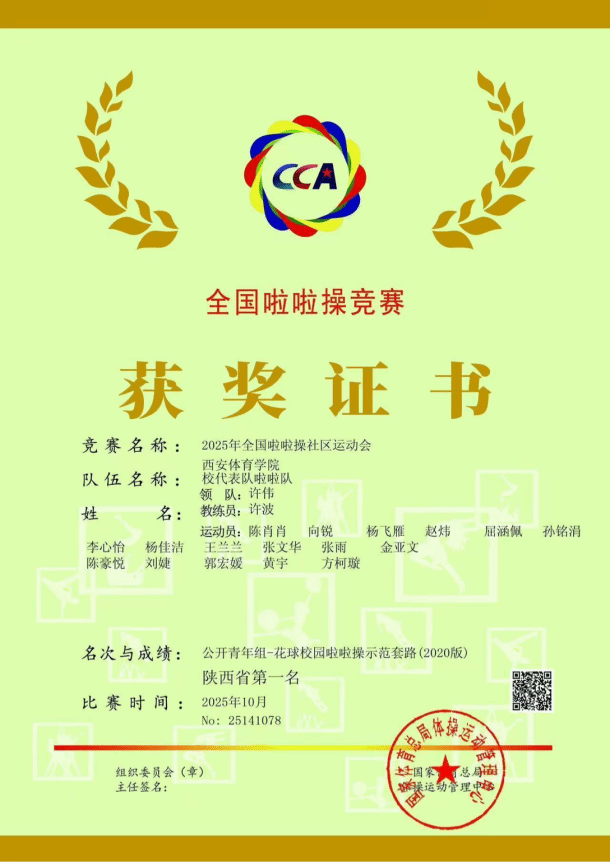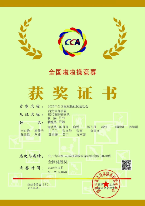 由我校体育教育训练学院研究生组成的14人啦啦操队,在此次公开青年甲组“花球示范套路”比赛中,从86支参赛队伍、1707人中脱颖而出,荣获全国优胜奖及陕西省第一名,为我校争得了荣誉。