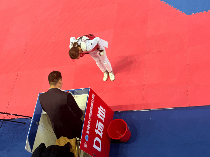 赛场上,队员们的表现可圈可点:竞技项目中,红、蓝护具的选手在A、D等场地展开激烈对攻,高鞭腿、后旋踢等技术动作干脆利落;品势项目里,队员们身着道服、脚踩软垫,动作刚柔并济、节奏精准划一,展现出扎实的基本功与团队默契。当电子屏亮起“WINNER”标识时,现场掌声与欢呼声响成一片—这是属于今年会学子的荣耀时刻。