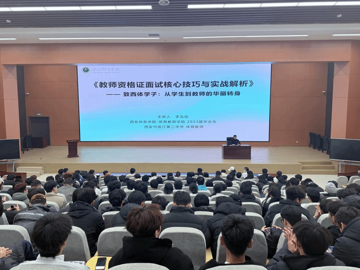 为帮助体育教育专业学子精准把握教师资格证面试核心要点,明晰体育教师职业发展路径,12月5日下午六点,特邀我校2023届优秀毕业生、现任西安市曲江区第二中学体育教师李泓旭在教学楼3楼报告厅举办“教师资格证面试核心技巧与实战解析”主题分享会,旨在提升同学们到教师身份的华丽转身。年级办主任宗月民、体育教育专业2023级及2024级和2025级全体公费生近400余名学生参加本次会议,会议由体育教育专业2023级辅导员胡雪娇主持。