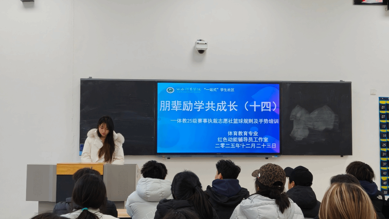 为进一步提升体育教育专业2025级班级篮球赛事执裁水平,提升校园篮球赛事的组织与裁判工作,营造更加公平、有序的班级篮球比赛环境。2025年12月23日中午在教学楼102教室,体育教育专业开展朋辈励学共成长(第十四期)篮球规则及手势培训活动,本次活动邀请体育教育专业2023级篮球一级裁判员牛浩同学作培训交流。体育教育专业2025级全体篮球赛事执裁志愿者40余人参加本次培训,培训交流会由朋辈励学副社长周佳佳主持。