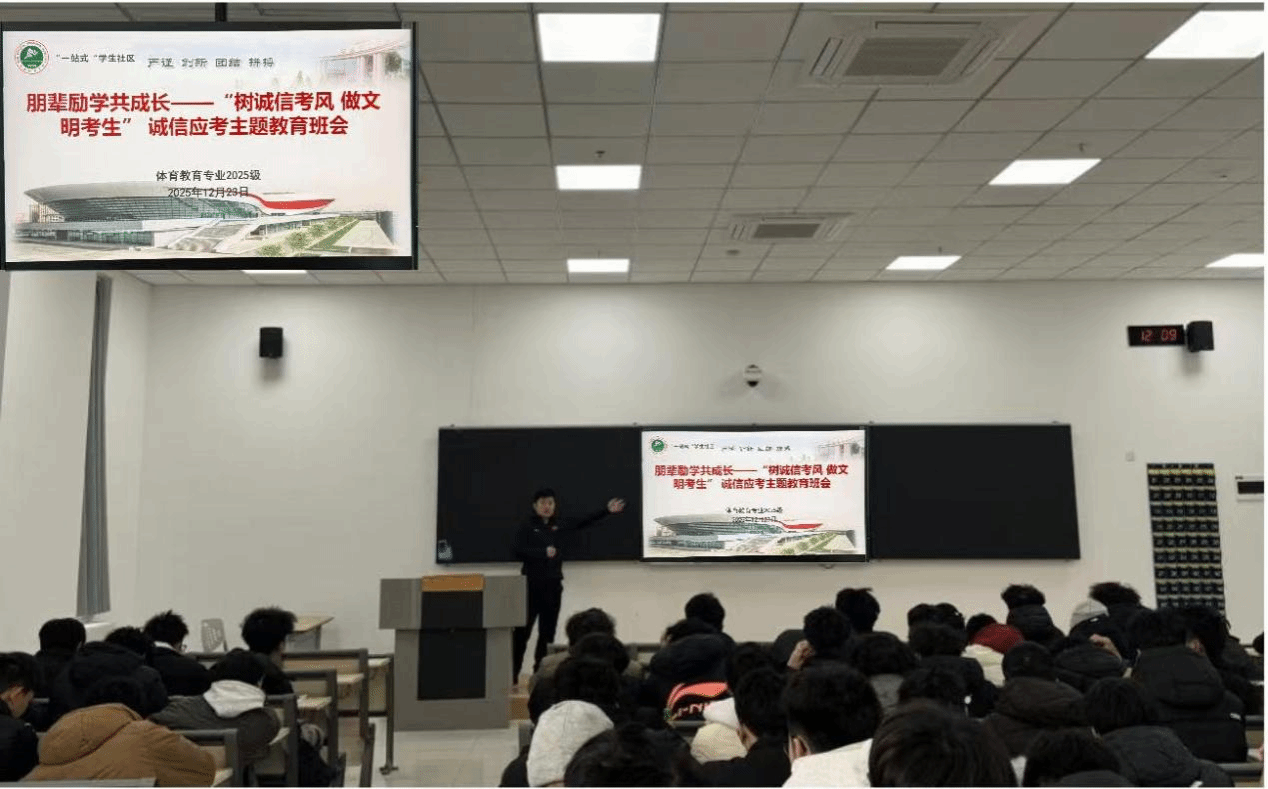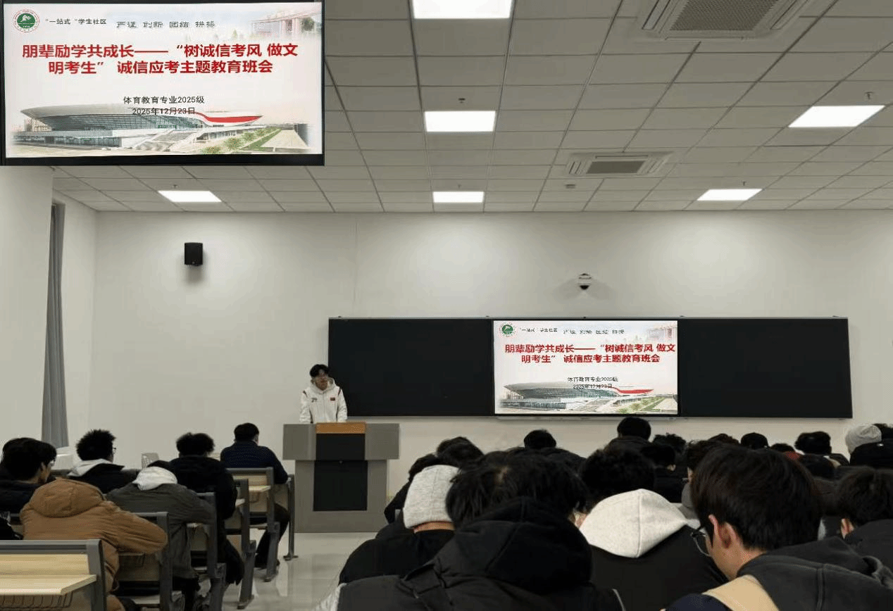 为营造风清正气的考试氛围,引导学生树立诚信应考意识,筑牢诚信应考的思想防线与纪律底线。12月23日中午,体育教育训练学院体育教育专业2025级于教学楼106组织召开“树诚信考风 做文明考生”诚信应考主题教育大会。会议由体育教育专业2024级陈梦何主讲,体育教育专业2025级辅导员张远及全体学生参加。