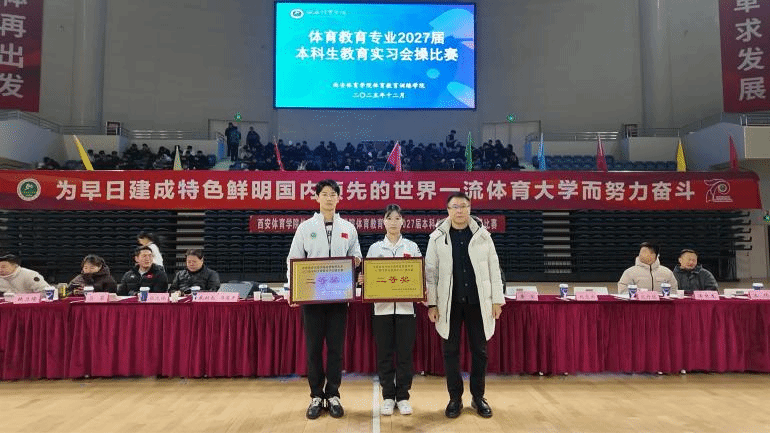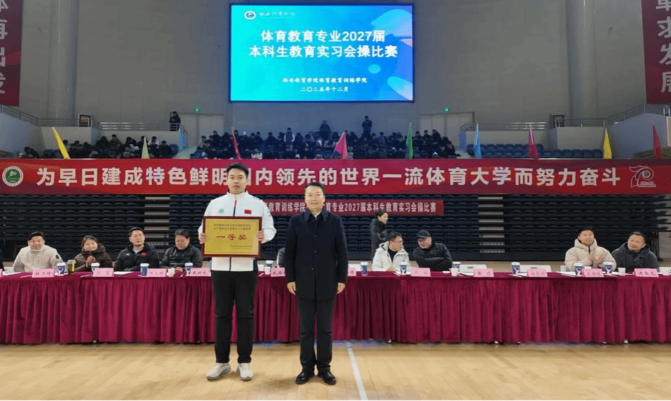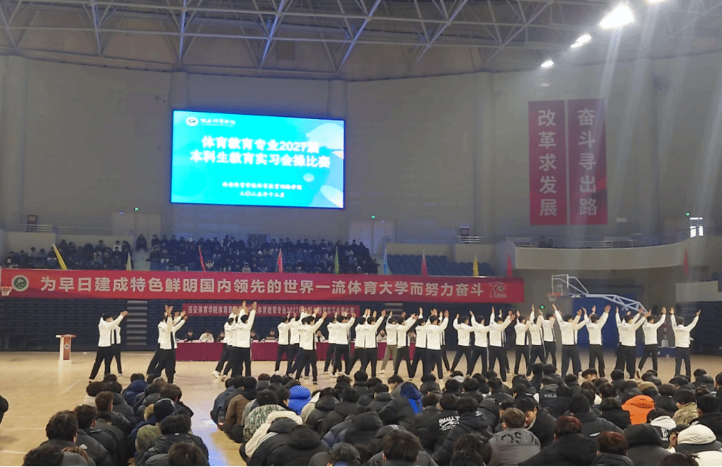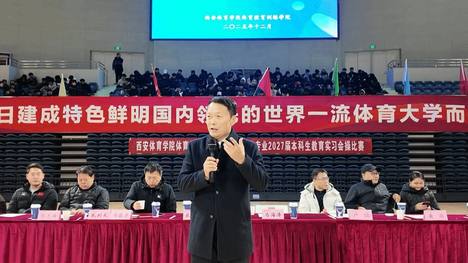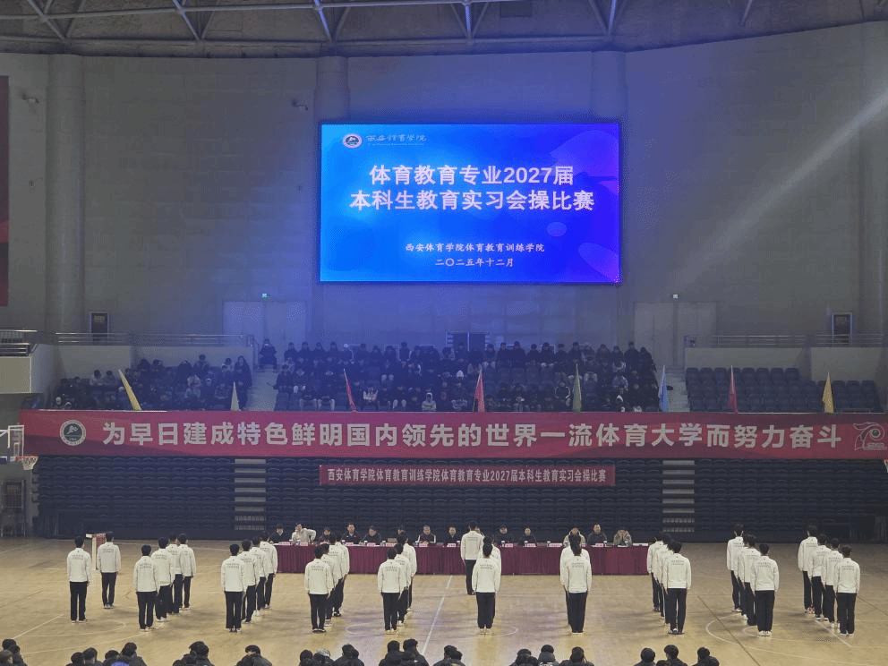 为深入贯彻落实体育教育专业人才培养要求,强化体育教育专业学生教学基本功训练,全面检验校内教育实习效果,2025年12月31日12:30,体育教育训练学院在鄠邑校区手球馆隆重举行体育教育专业2027届本科生教育实习会操比赛。校党委副书记、学院院长马海涛、学院党委书记卢喆、学院副院长武洛生、学院党委副书记黄岗、体操教研室主任、本次比赛裁判长冯俊彦以及各位评委老师出席本次活动。参加本次活动的还有校内实习指导教师、党政办公室主任、教学秘书、体育教育专业全体辅导员和全体同学们,比赛由体育教育训练学院年级主任宗月民主持。