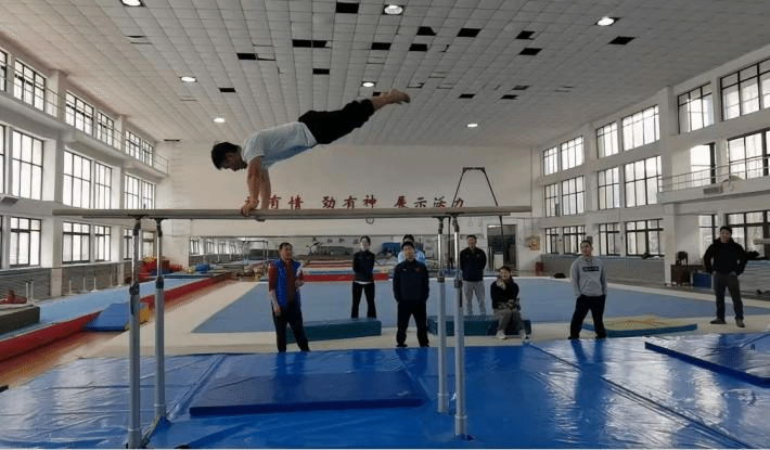 理论学习后,活动转入体操馆现场实操环节。专业教师进行了双杠、自由体操等项目的成套动作示范,直观展示了考核标准在实际动作中的应用。