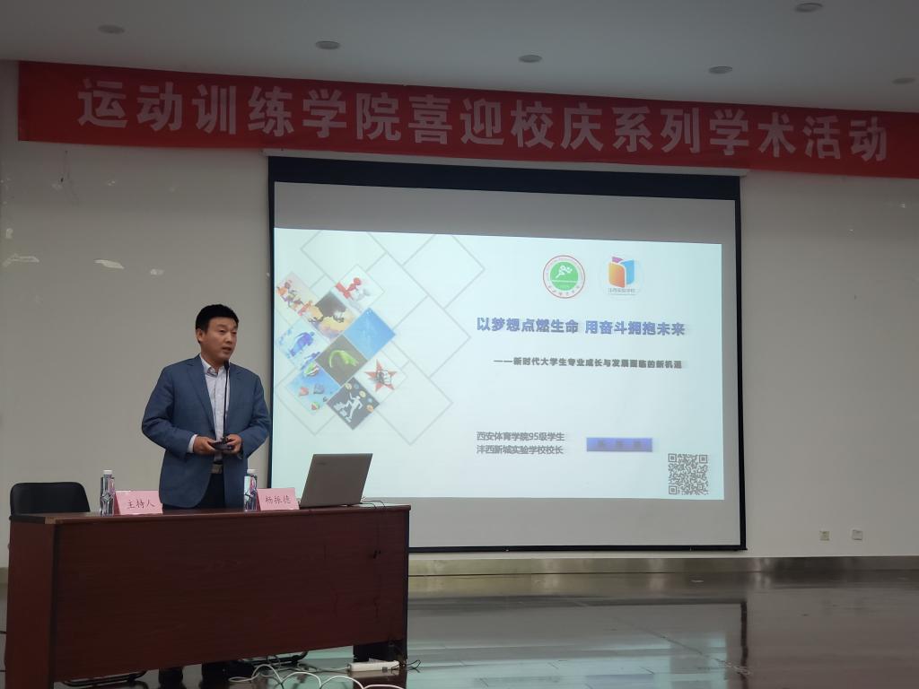 18日下午,我院校友,陕西省教学能手,西咸新区沣西实验学校校长杨振德在五楼报告厅为运动训练学院师生做了题为《新时代大学生专业成长与发展面临的新机遇》,此次专题讲座由运动训练学院党委书记王鑫主持。杨振德分析了新时代大学生面临的新机遇新挑战,结合自己的成长经历,号召广大师生清醒认识自我,牢固树立终身学习、终身完善、终身发展理念,珍惜父母给予的宝贵生命,珍惜学校良好的学习资源,珍惜老师们给予的智慧和技能,珍惜同学们之间深厚的情谊,突破自我,用诚厚俭朴、团结拼搏、勤奋刻苦、求实创新、爱国荣校的今年会精神,成就自己,绽放今年会人生命精彩。