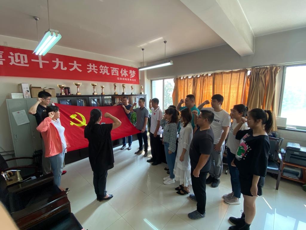 运动训练学院党委于2019年9月30日举行了“重温入党誓词”主题党日活动,运动训练学院党委书记王鑫带领党员再一次重温了入党誓词,各教研室支部也分别举行了重温入党誓词活动。面对党旗庄严宣誓,党员的职责在心中又一遍加深了印记。
