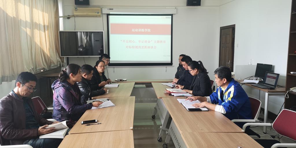 2019年10月30日下午2:30,运动训练学院党委在综合训练馆6楼会议室,结合学校“不忘初心,牢记使命”主题教育专题研讨计划和学院主题教育相关工作安排,展开了“对标检视找差距”“奋进有为抓落实”两个专题的学习研讨。