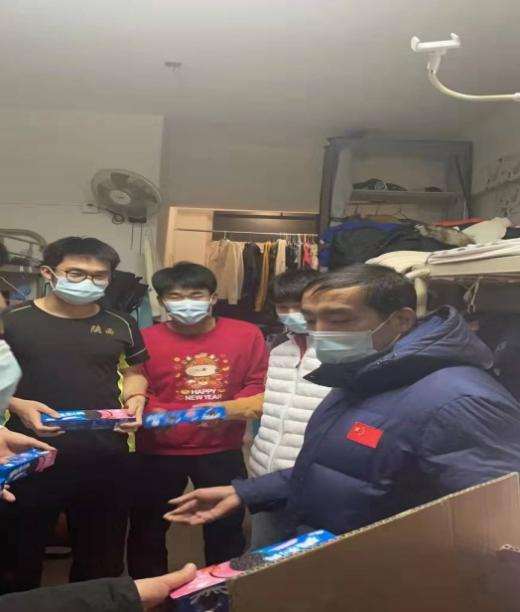 照片六:运动训练学院武洛生给学生发放元旦小礼包
