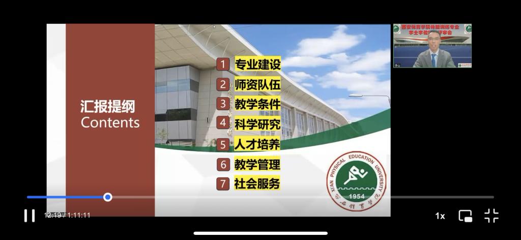陈彦副校长向各位专家评委们介绍了我校按照习近平总书记关于教育的重要论述和全国教育大会的精神,围绕体能训练专业学位建设所作的积极投入以及对下一步体能训练专业学位建设的重点与方向。体能训练专业负责人李山教授向各位专家评审介绍了我国体能训练专业建设与发展的历史,也指出了我校体能训练专业建设的必要性。同时,李山教授也从我校体能训练专业所具备的优秀的师资力量、高水平的场地设施以及在可视化教学模式下我校体能训练专业发展的未来设想等七个方面向各位评审专家进行了介绍。