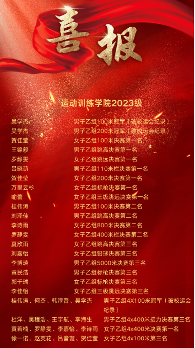 本次田径运动会,学院高度重视,精心组织,各年级均派出了一支实力强劲的参赛队伍。运动员们经过长时间的刻苦训练,准备充分,信心满满地踏上了赛场。在比赛中,运动训练学院的运动员们展现出了非凡的实力和顽强的拼搏精神。他们不仅在个人项目中屡创佳绩,还在团体项目中发挥出色,为学院争得了荣誉。本届校运会学院共计18人次打破11项校运会纪录,其中2021级张珺怡在女子乙组铅球项目获得亚军,并打破该项校运会纪录;2021级苏航、张远沐 、徐文正、张昊东在男子乙组4×400米获得亚军,并打破该项校运会纪录;2022级刘浩龙在400米栏项目获得冠军,并打破该项校运会纪录;2022级宋吴波在200米栏项目获得季军,并打破该项校运会纪录;2023级吴学杰在男子乙组100米、男子乙组200米项目获得冠军,并分别打破该项校运会纪录;2023级桂伟涛、何杰、韩淳晋、吴学杰四人在男子乙组4×100米接力项目获得冠军,并打破该项校运会纪录;实验班杨星宇在男子乙组400米项目获得冠军,并分别打破该项校运会纪录;实验班谭玉详在男子乙组400米项目获得亚军,并打破该项校运会纪录;实验班曾燕在女子乙组800米项目获得冠军,并打破该项校运会纪录;实验班李剑、李鹏瑞、李谟竹、张力丹在男子乙组4×100米接力项目获得亚军,并打破该项校运会纪录。运动训练学院在本届田径运动会上的优异表现,充分彰显了学院的教学成果和训练水平。