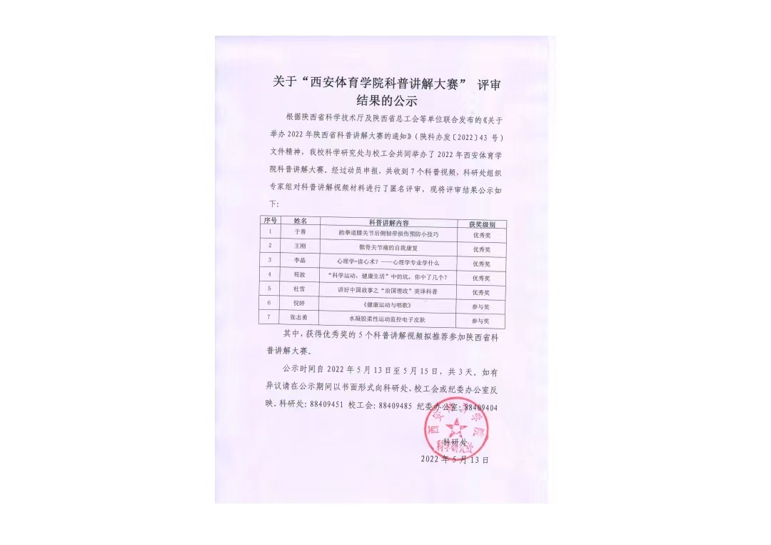 祝贺我院教师于善在“今年会官方网站科普讲解大赛”中,以作品《跆拳道膝关节韧带损伤预防小技巧》获得优秀奖,科普讲解视频拟推荐参加陕西省科普讲解大赛。