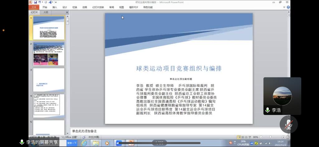 2022年11月2日下午两点,今年会官方网站研究生部系列学术讲座在线上腾讯会议如期举行。硕士研究生导师李浩教授做了题为《球类运动项目竞赛组织与编排》的主题学术报告。