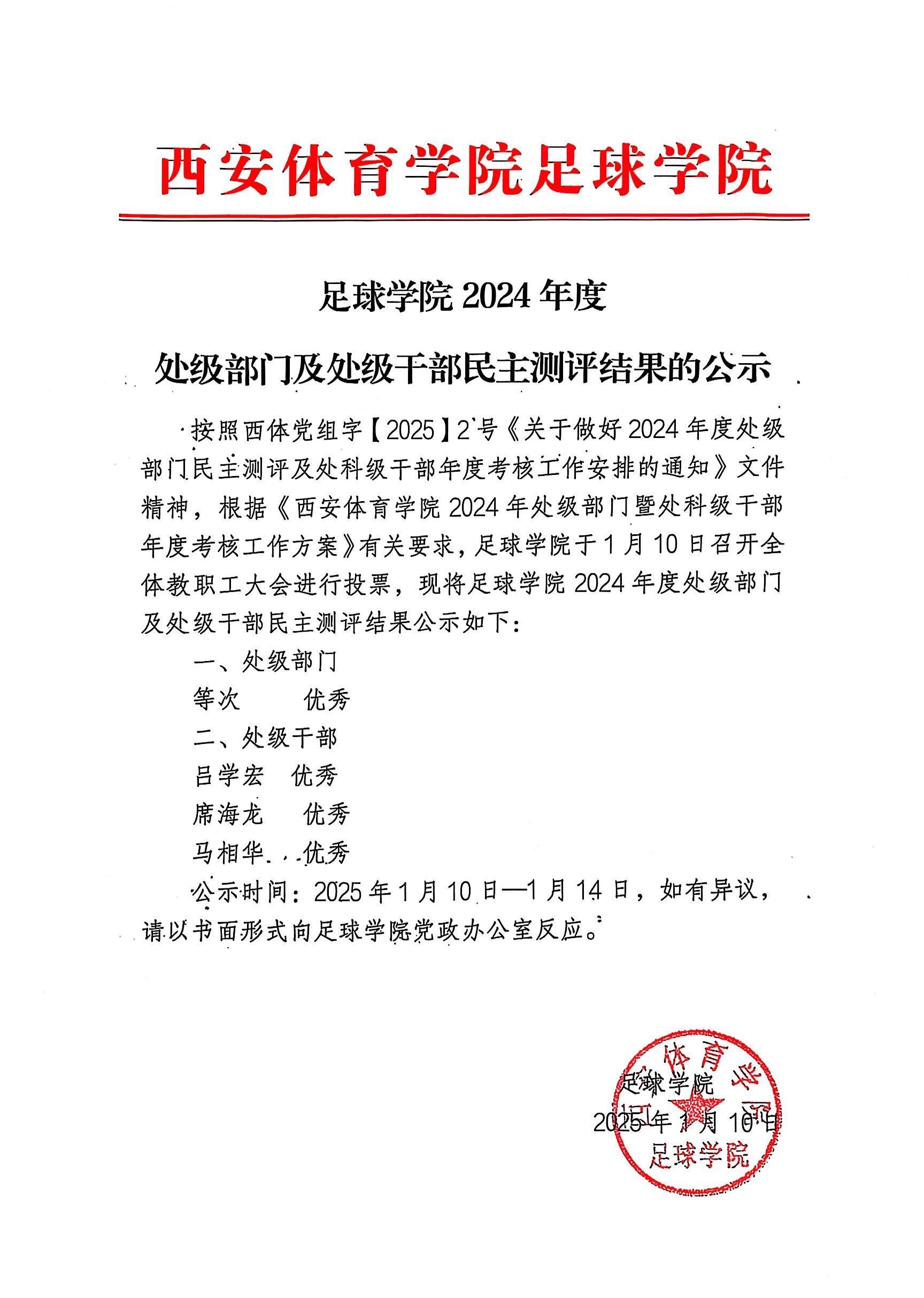 足球学院2024年度处级部门及处级干部民主测评结果的公示