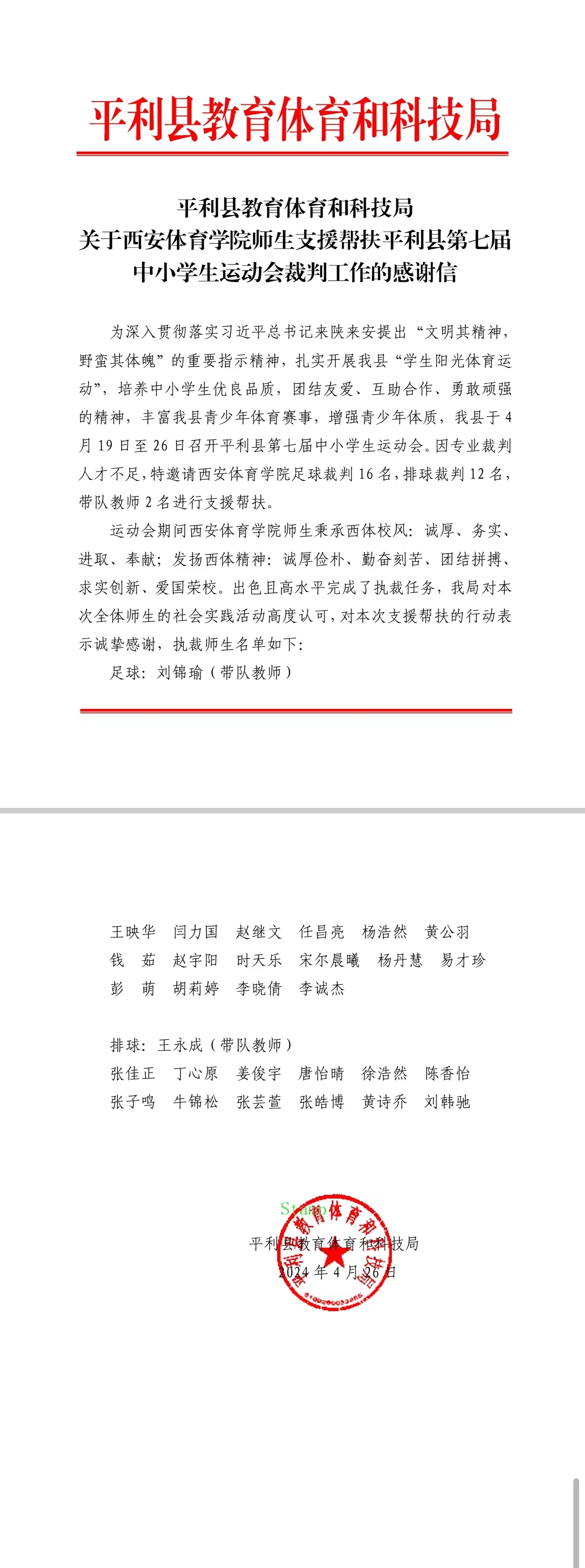 平利县教育体育和科技局对我院师生在平利县第七届中小学生运动会中承担的裁判帮扶工作致信感谢,表达了高度认可。这封感谢信不仅是对我院裁判工作的肯定与激励,更是对全体参与人员的辛勤付出的赞誉。