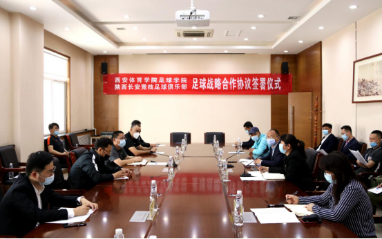 4月30日上午,我校足球学院与陕西长安竞技足球俱乐部签署了战略合作协议。校党委副书记、纪委书记赵军,陕西长安竞技足球俱乐部董事长张新宇一行与足球学院党总支书记姜梅,副院长席海龙以及教师代表等共同出席了本次签约与授牌仪式。